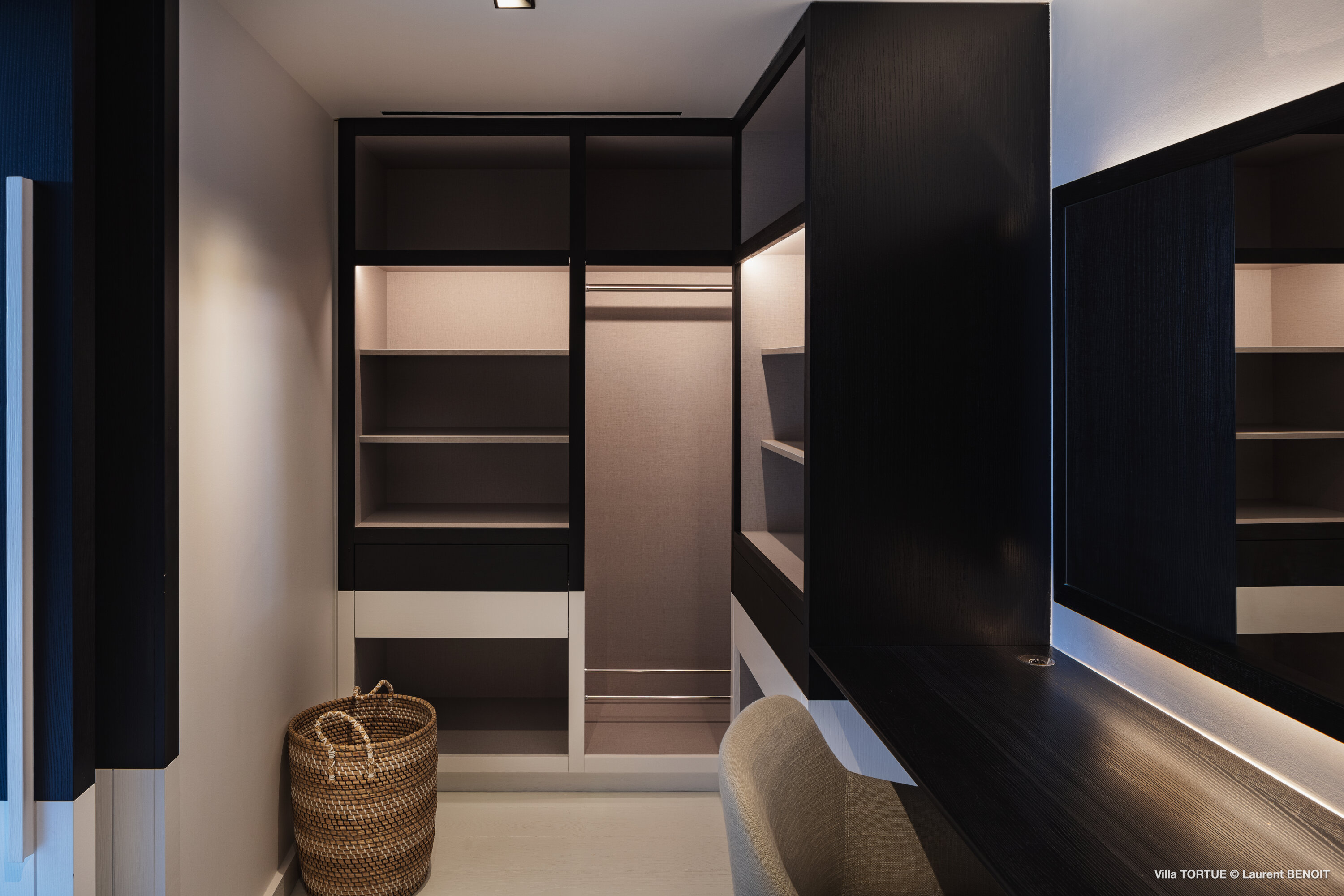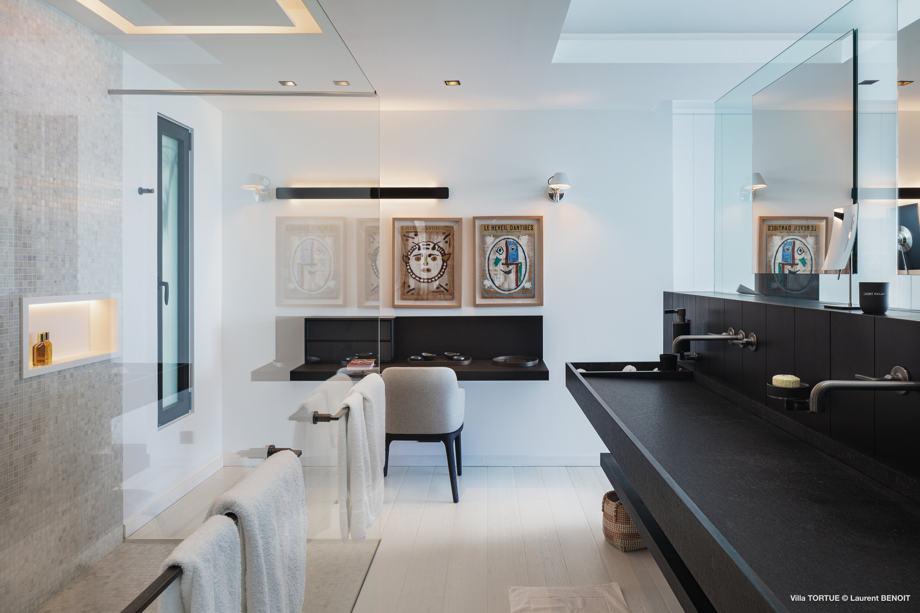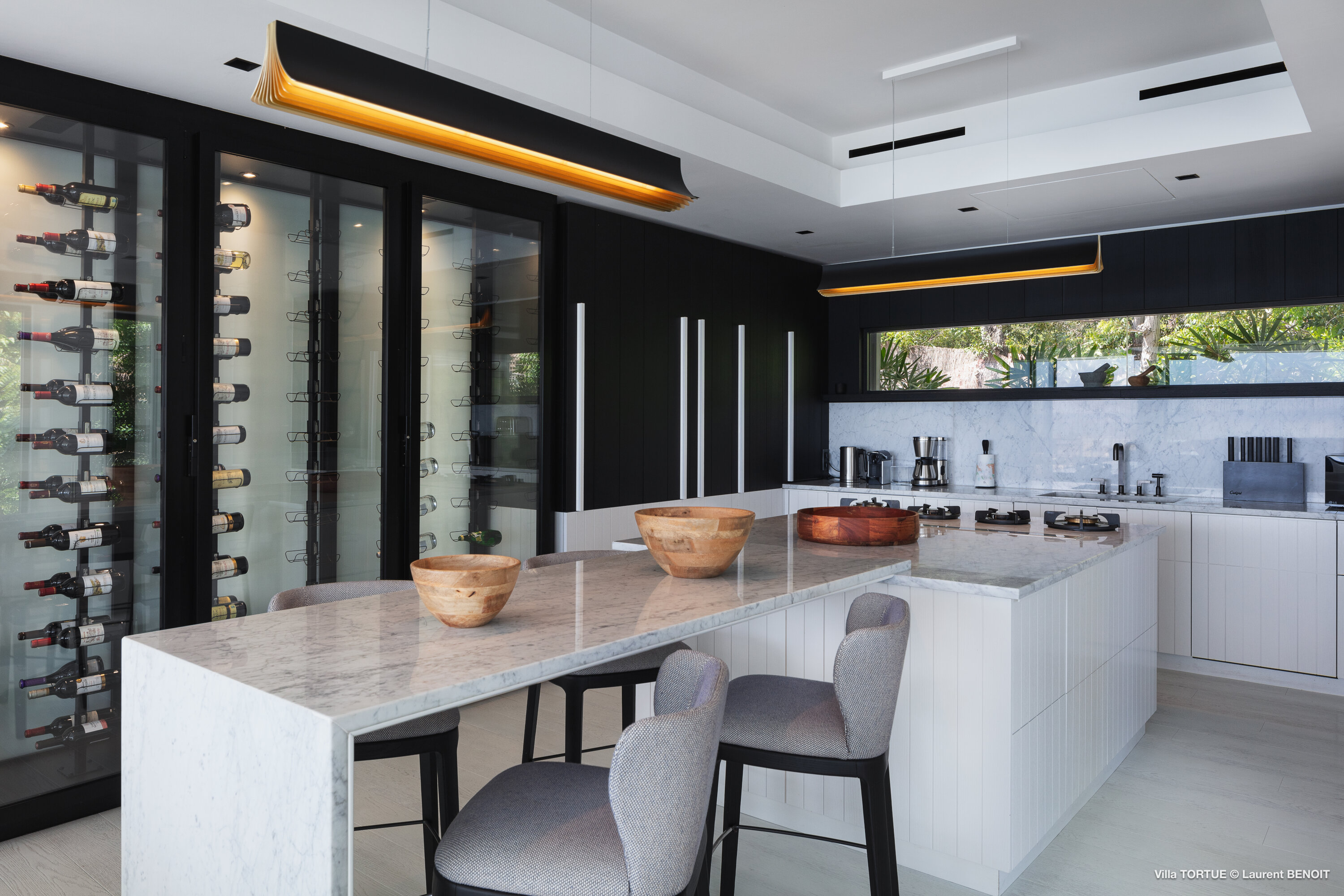 Built across three levels, the villa immediately impresses with its striking modern architecture, clean lines, and sophisticated black-and-white color palette. Custom-designed furnishings, high-end finishes, and expansive floor-to-ceiling windows enhance the generous interiors, filling each space with natural light and framing the sea at every turn.