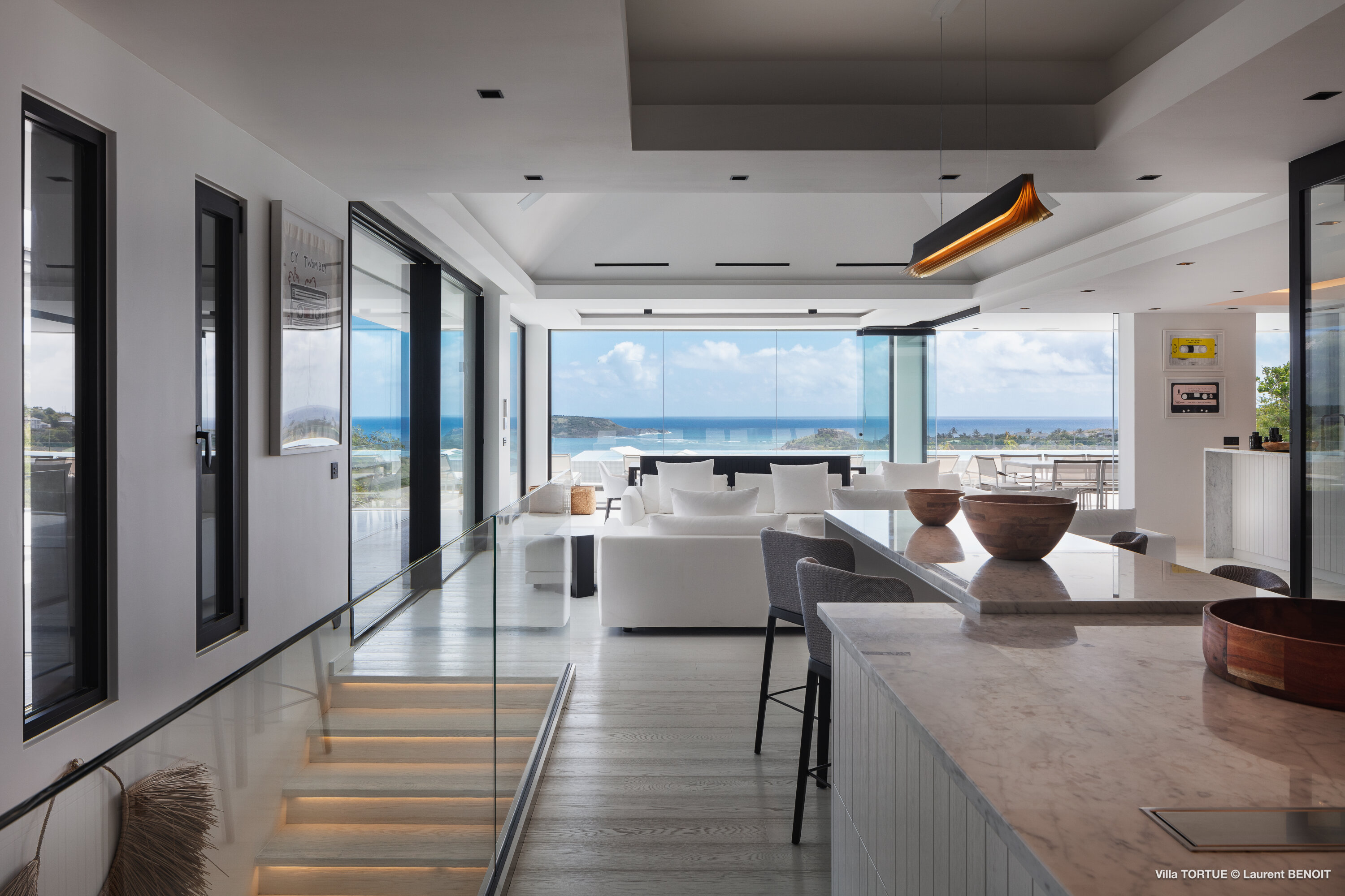 The main level features a spacious open-plan living area that brings together a refined lounge, an inviting dining space, and a fully equipped kitchen—perfect for relaxed gatherings and shared moments. This level opens onto a spectacular ocean-facing terrace, where the infinity pool appears to blend seamlessly into the turquoise waters of the bay. Sun loungers, shaded lounge areas, and an outdoor dining space beneath a gazebo with barbecue create an ideal setting for both sun-soaked days and elegant tropical evenings.