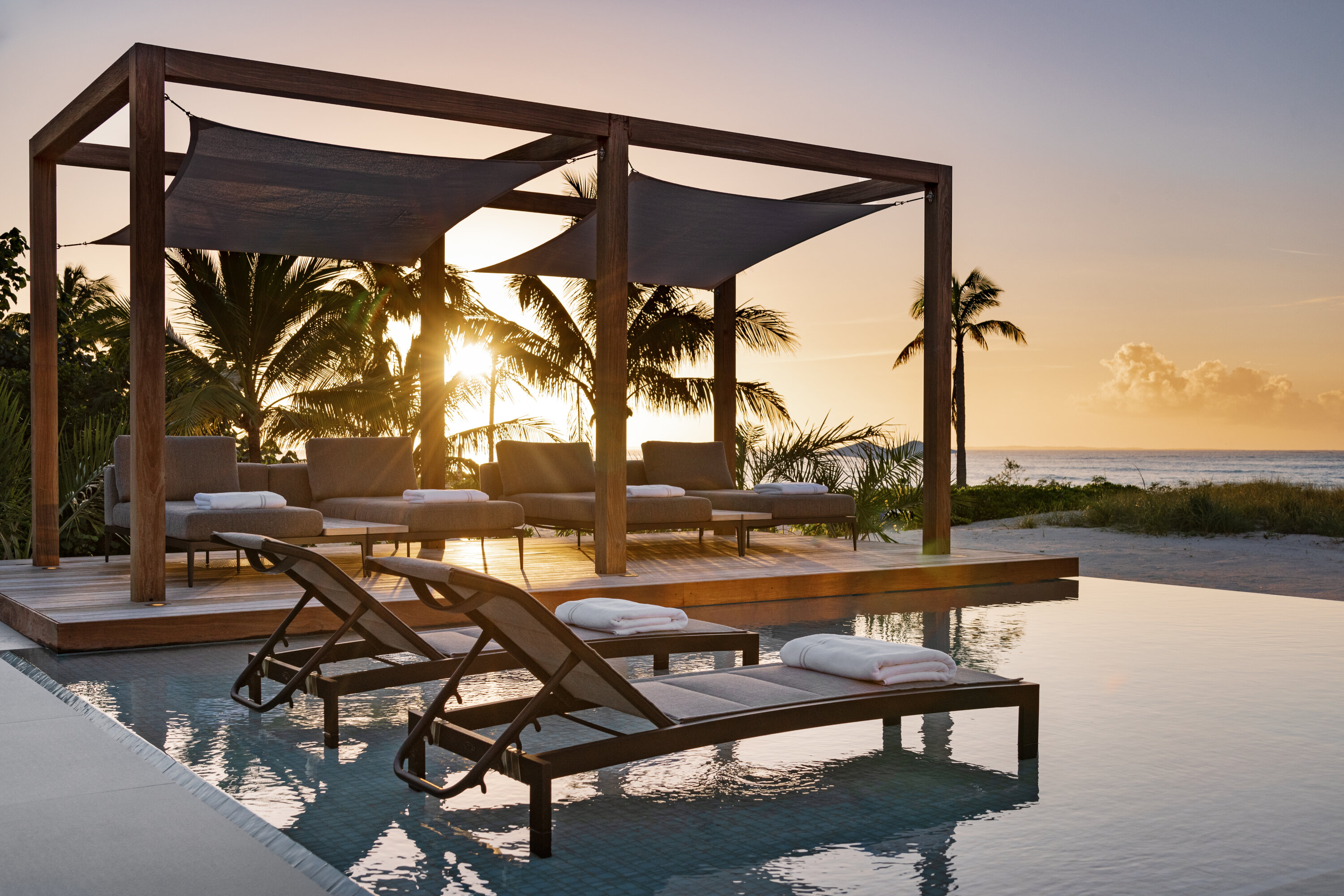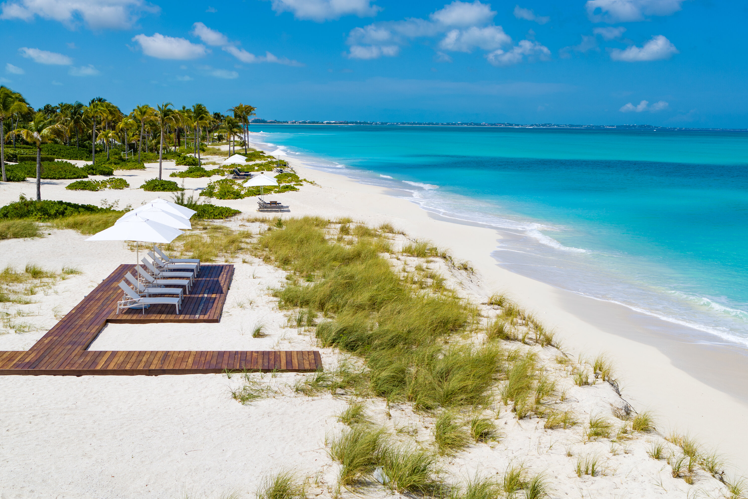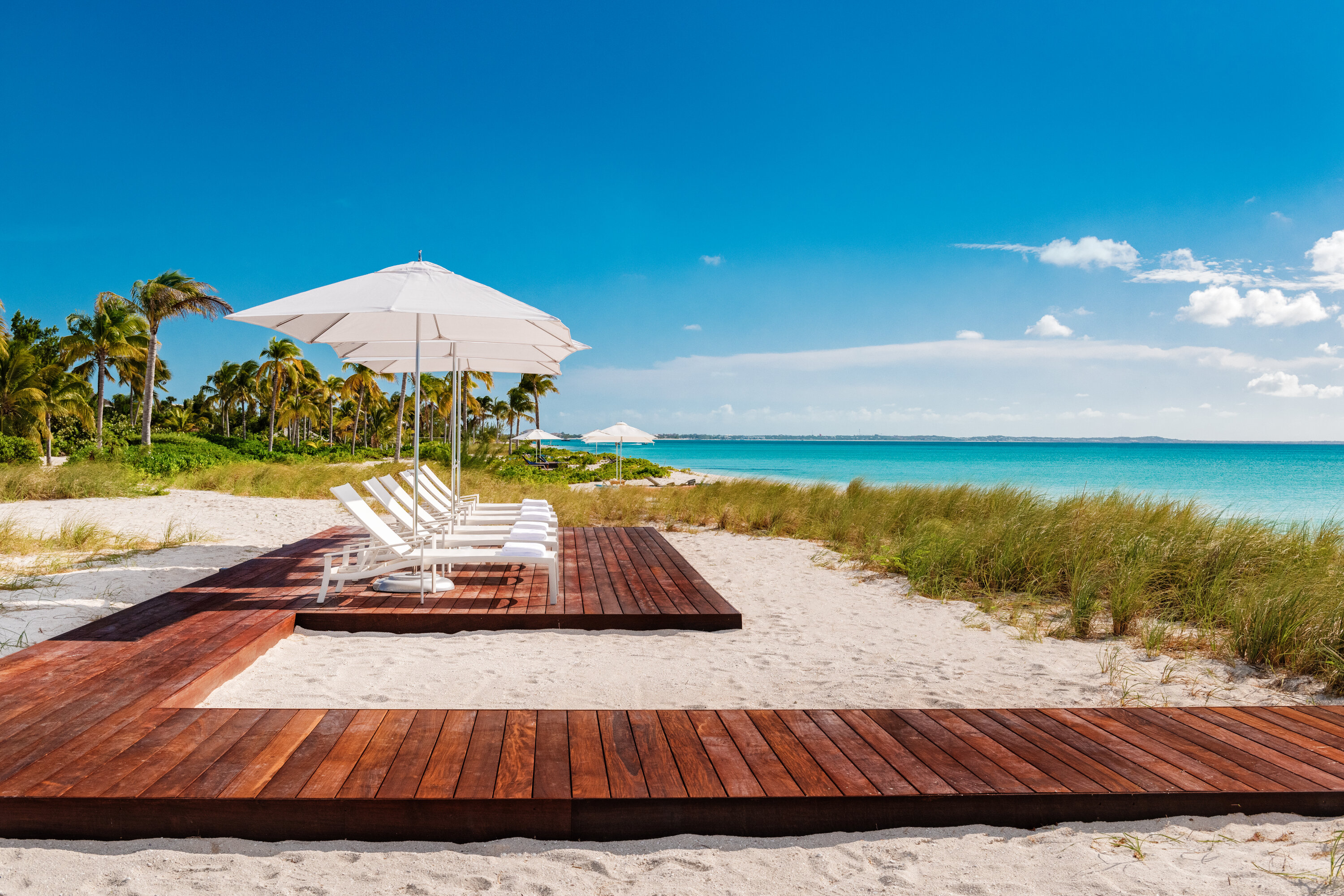 Experience sunsets over Grace Bay Beach from the beach deck, with waves lapping only a few feet away. The crystalline waters are perfectly calm and inviting; this is the definition of an island paradise.