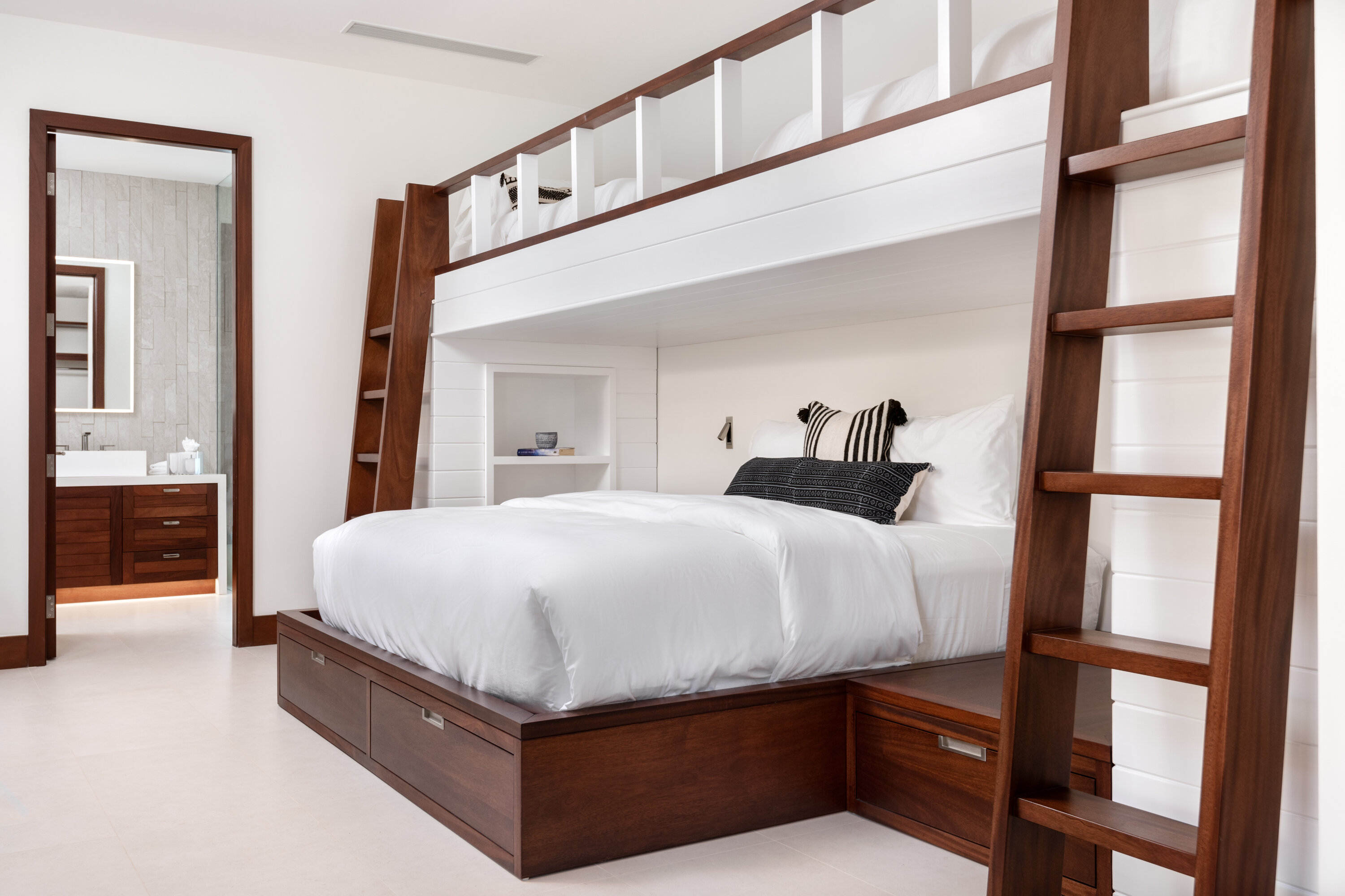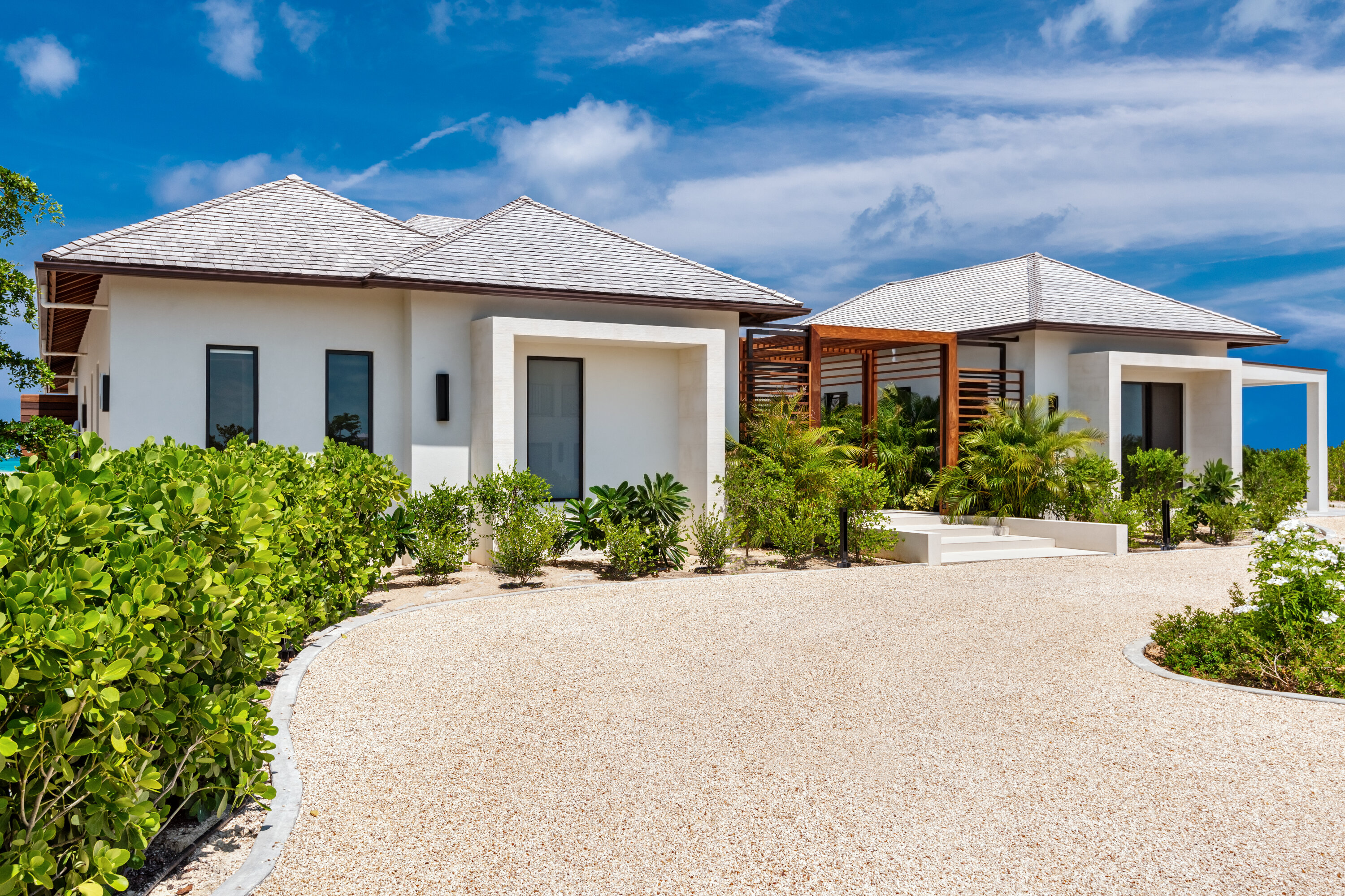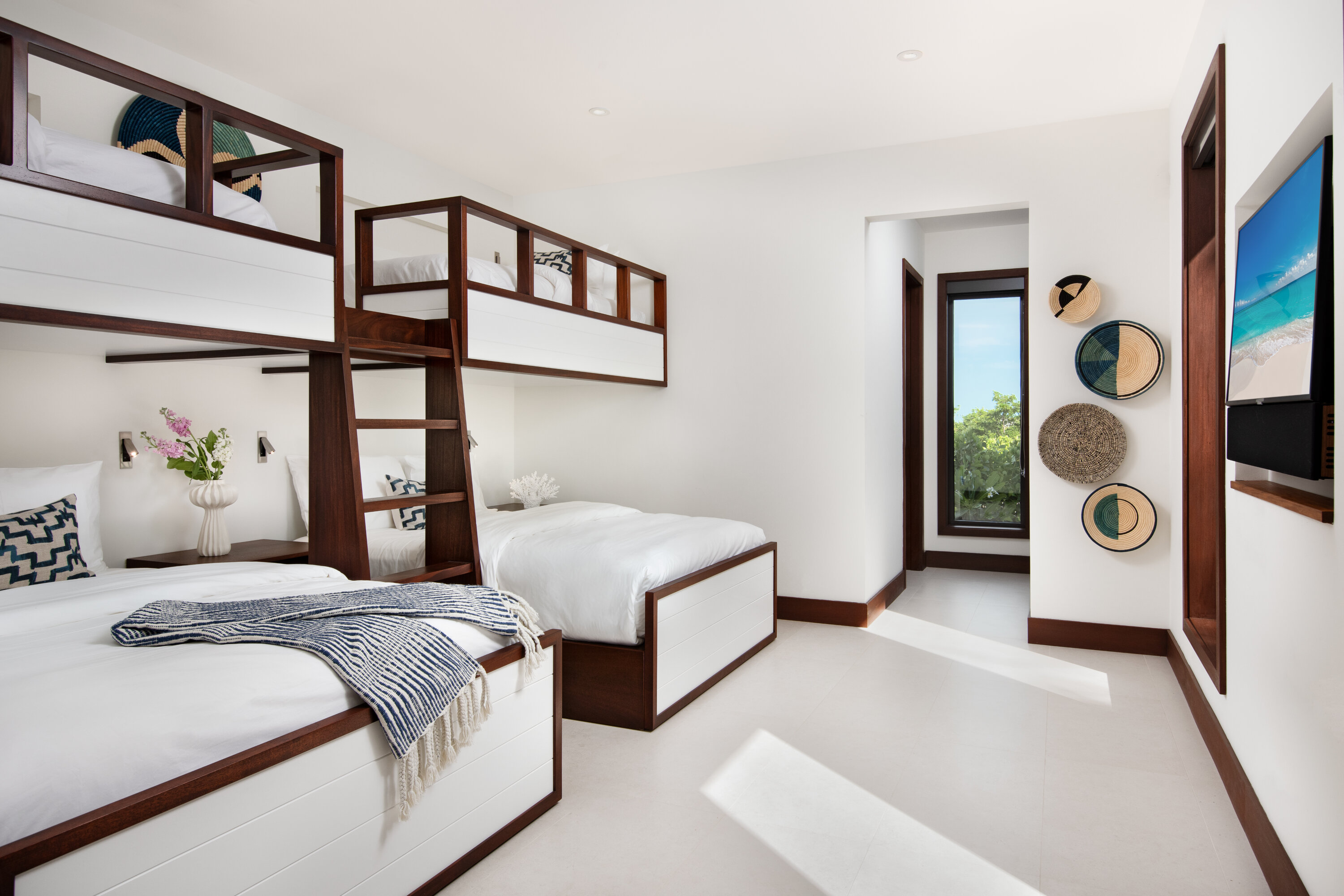 Three master suites enjoy incredible king-sized beds and stunning views over the beautiful white sand and turquoise waters. Beautiful, vaulted roofs feature dark paneled wood, helping to keep the atmosphere nice and tranquil and ensuring a good night’s rest.