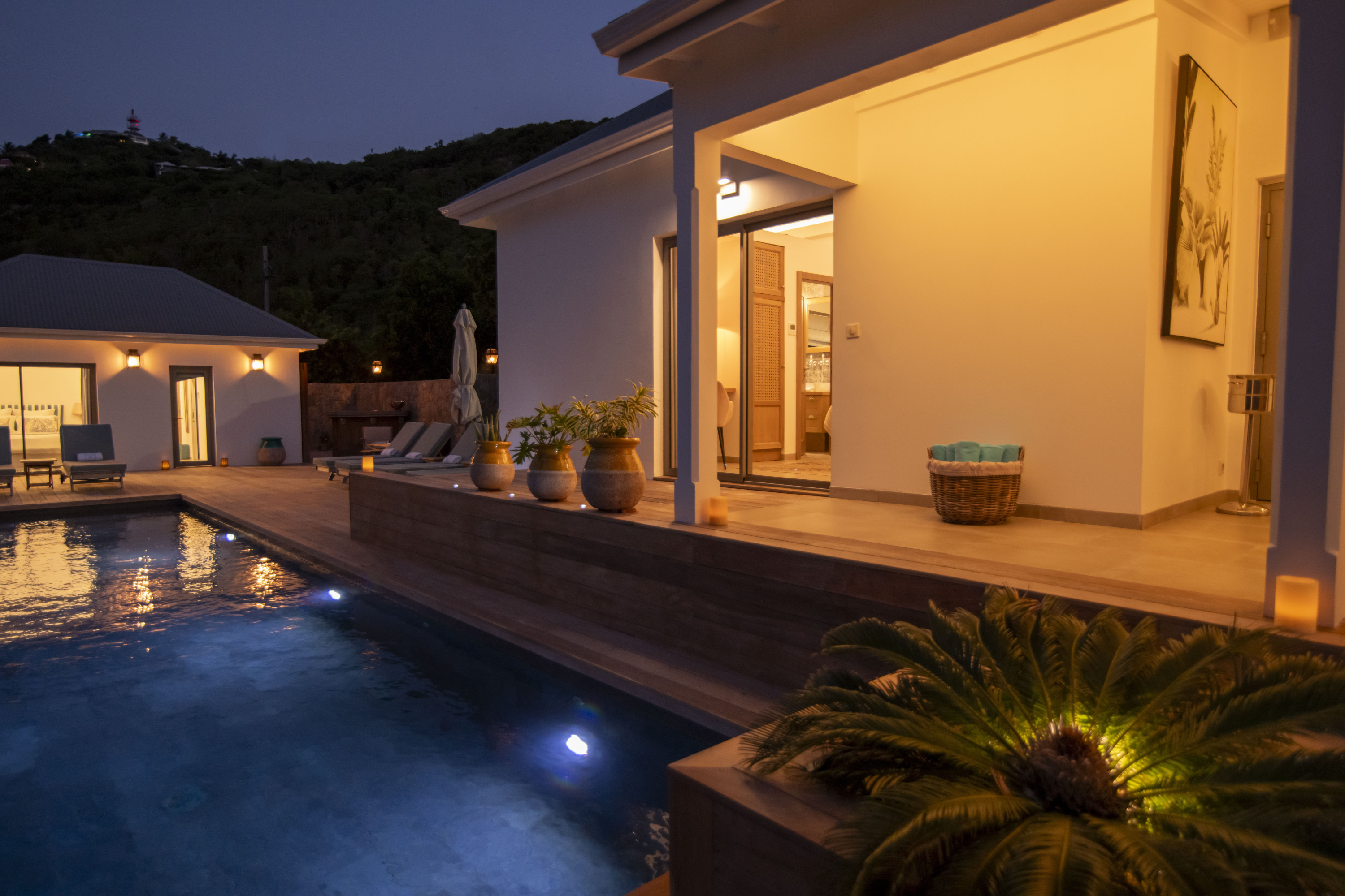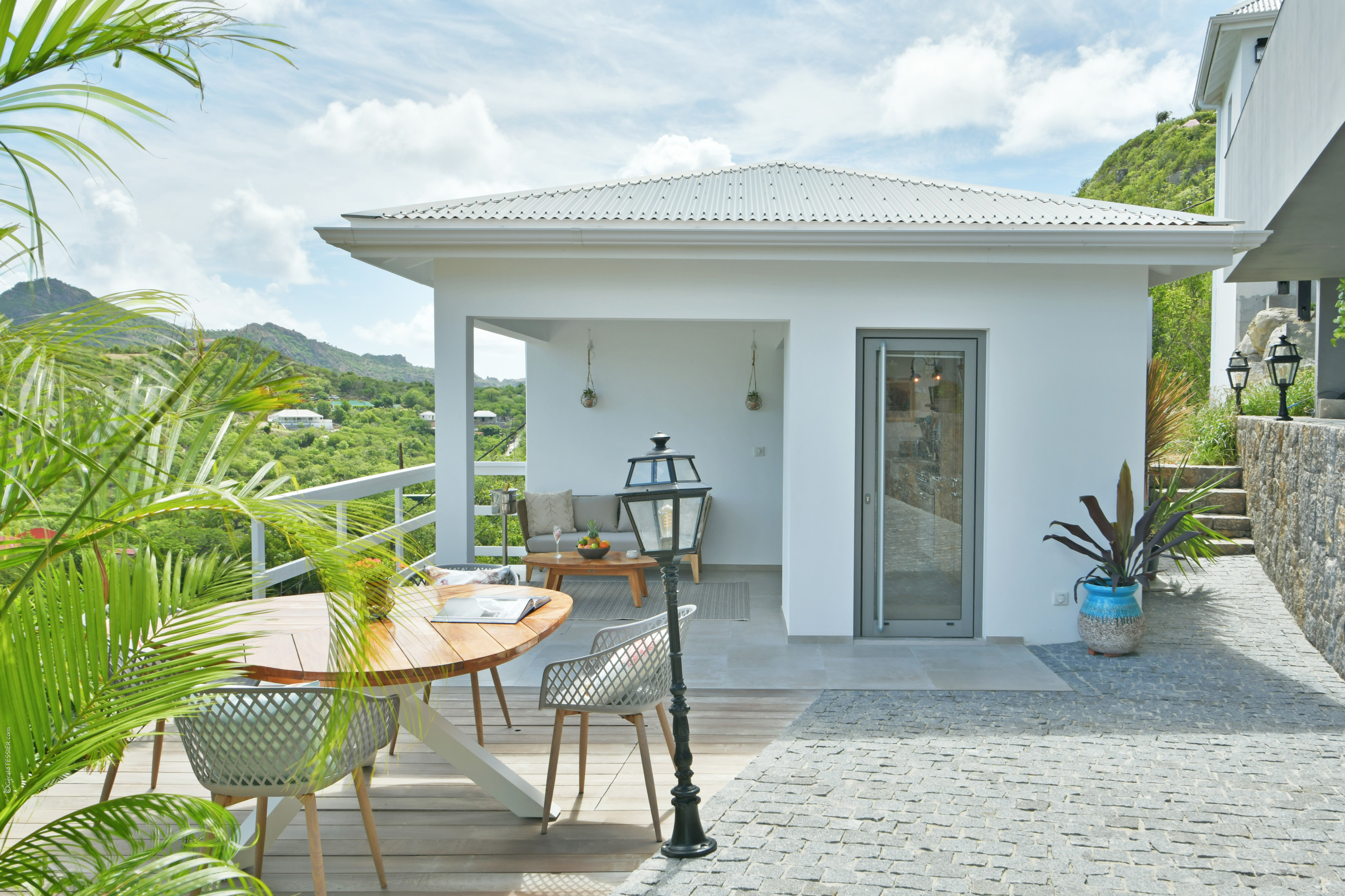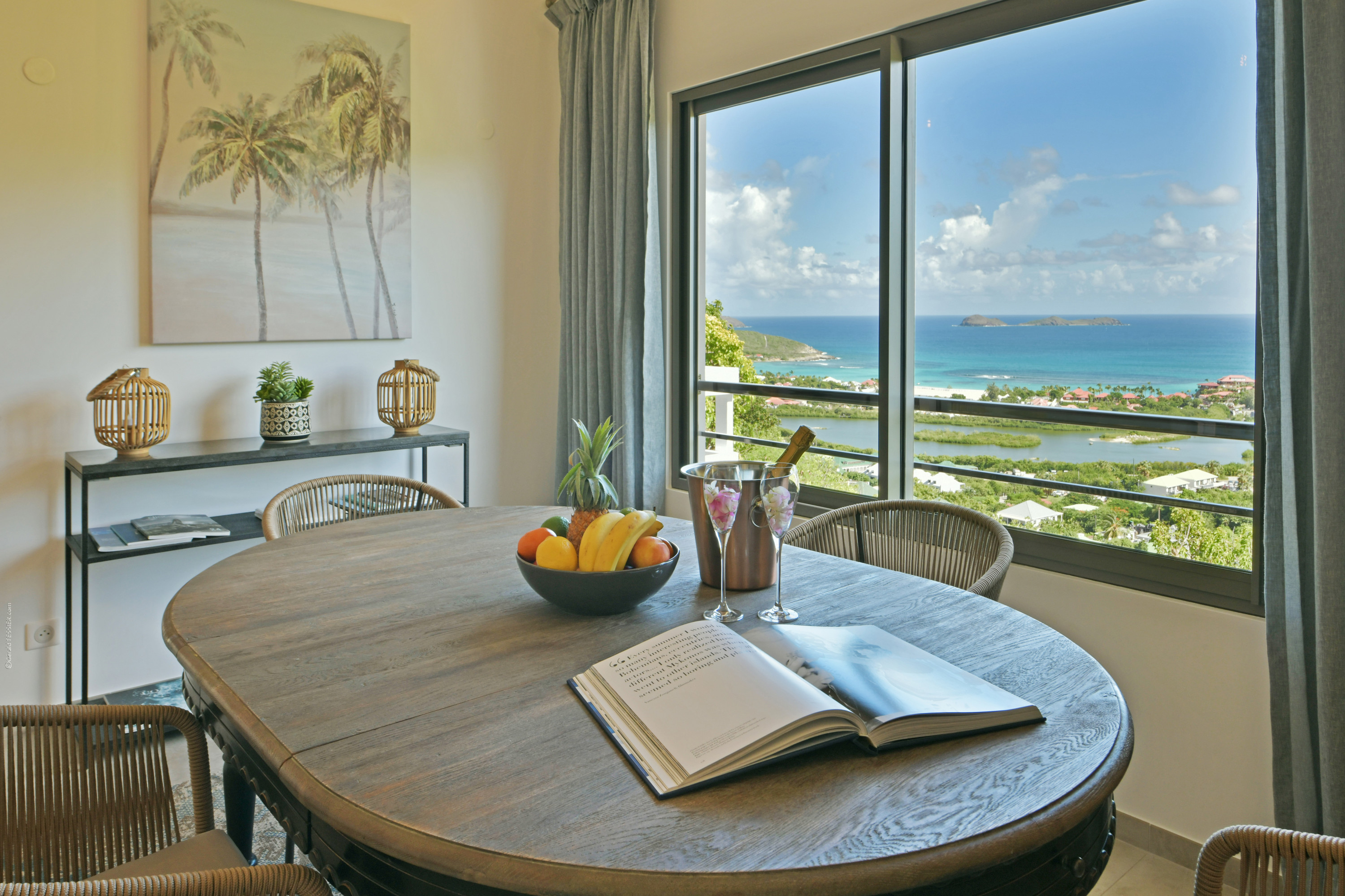 Villa Vogue, (villa code: WV VGE) is a 5-bedroom villa set on the mountainside with views of the rolling hillside along with the turquoise waters of St. Jean Baie. The air-conditioned main room, with the living room and the very well-equipped open kitchen, opens onto the outdoor terrace with a covered dining and sitting area and the beautiful heated pool. On the same level, there are 3 bedrooms, one of them has direct access from the living room, and the other 2 are located in independent bungalows. The air-conditioned gym is also on the same level. On a lower level, the Guest House offers two additional bedrooms offering the same equipment as well as a lounge area and a second fully-equipped kitchen. During the December holidays, the villa rents at the full occupancy rate regardless of how many bedrooms are used. * Note - A four-wheel drive is highly recommended.Please fill out the form to begin your inquiry and we will connect you with a seasoned villa rental specialist.