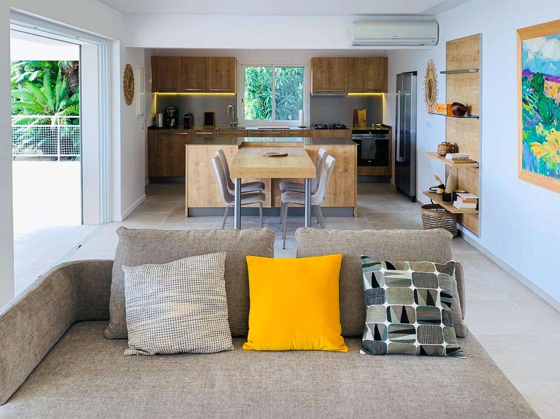 Recently renovated, the living spaces of Villa Wish feel refreshing, cool, and breezy. Spread over two bungalows connected by the outdoor terrace, the contemporary furnishings in both provide every comfort. The main bungalow features an open-plan great room, with a living area, dining table, and kitchen.